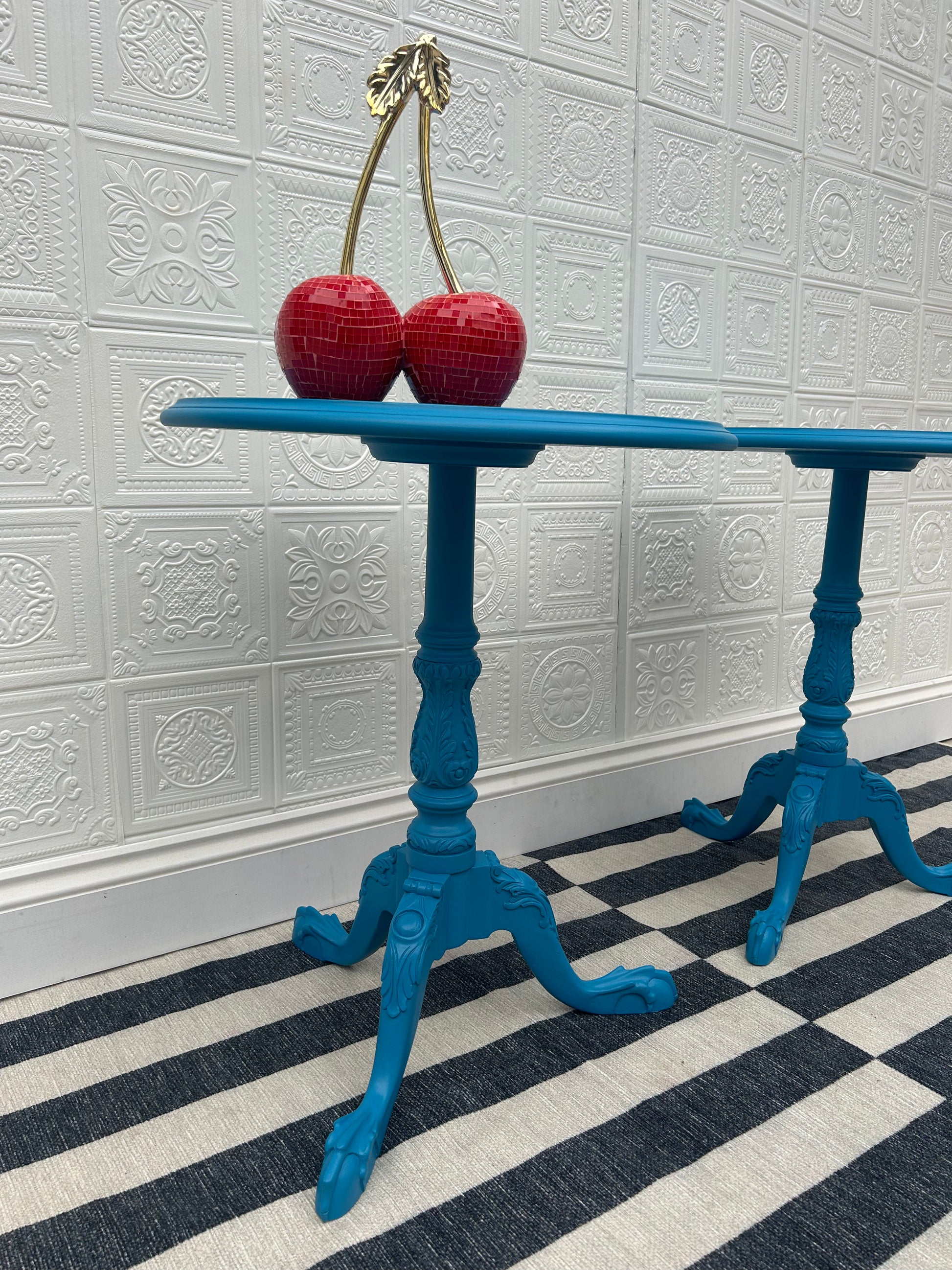 Caribbean Blue Vintage Hand-painted Occasional Tables / Pair of Unique Vibrant Accent Tables