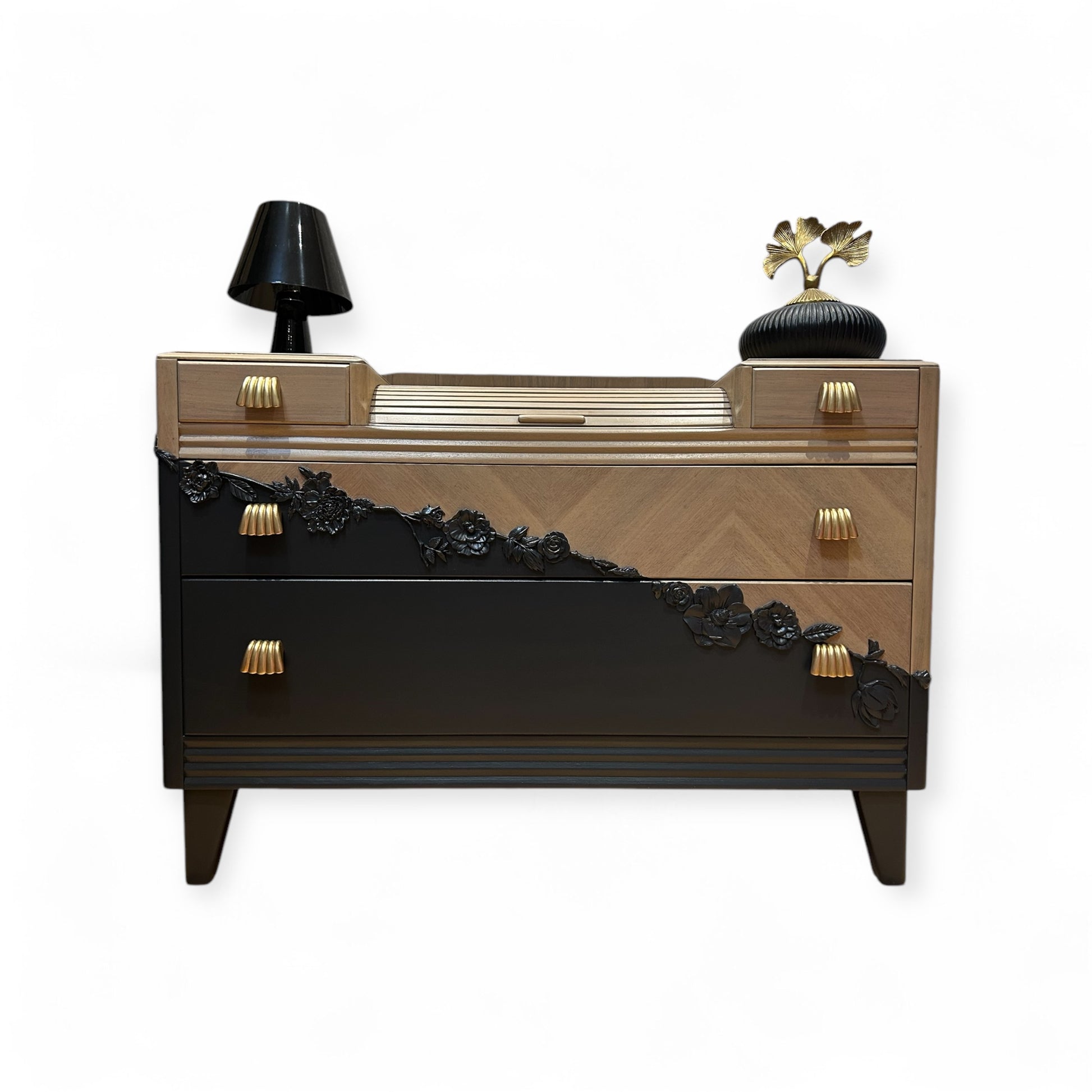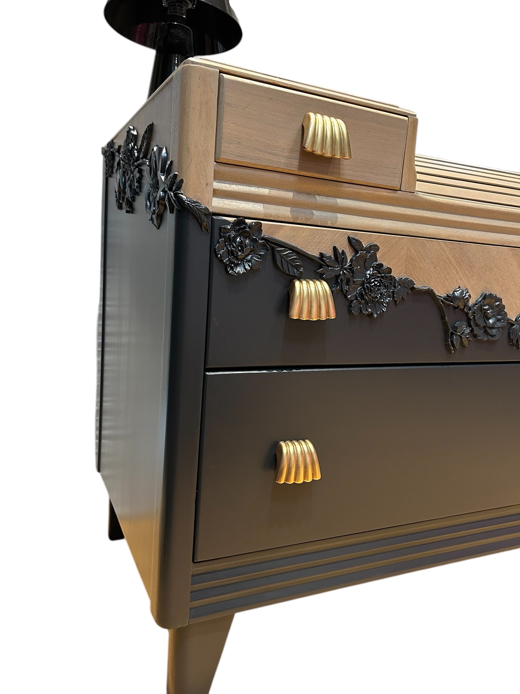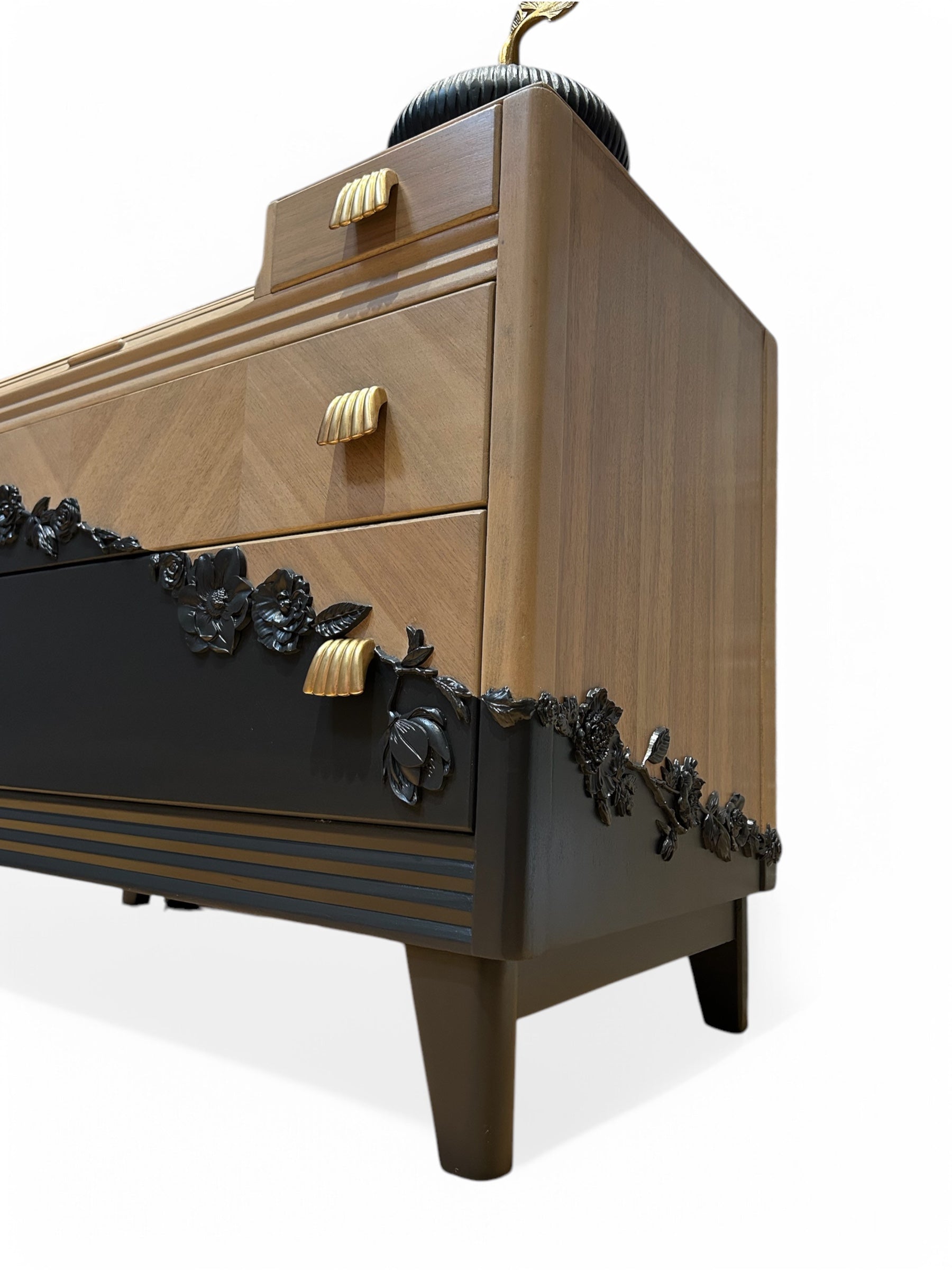 Diagonally Lightened Natural Wood bordered with an organic floral arrangement, handprinted in a rich darkest grey with corresponding lower.