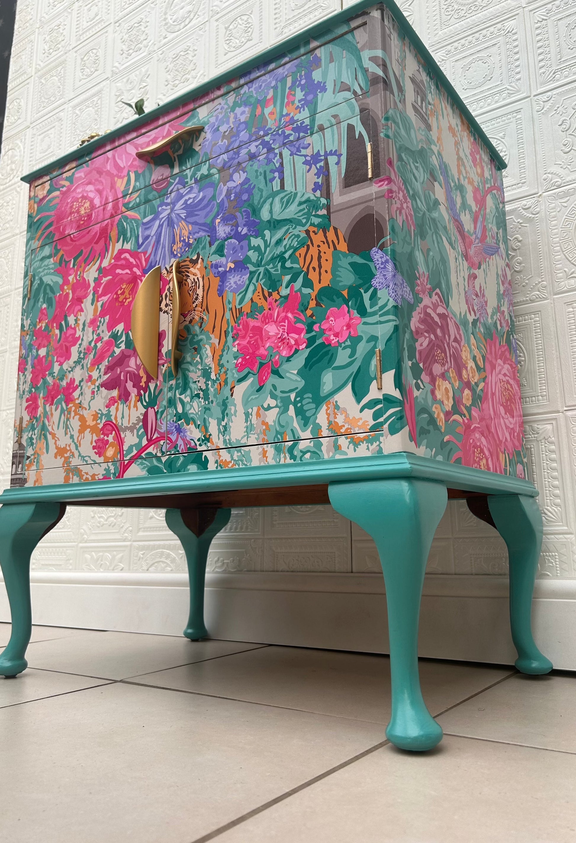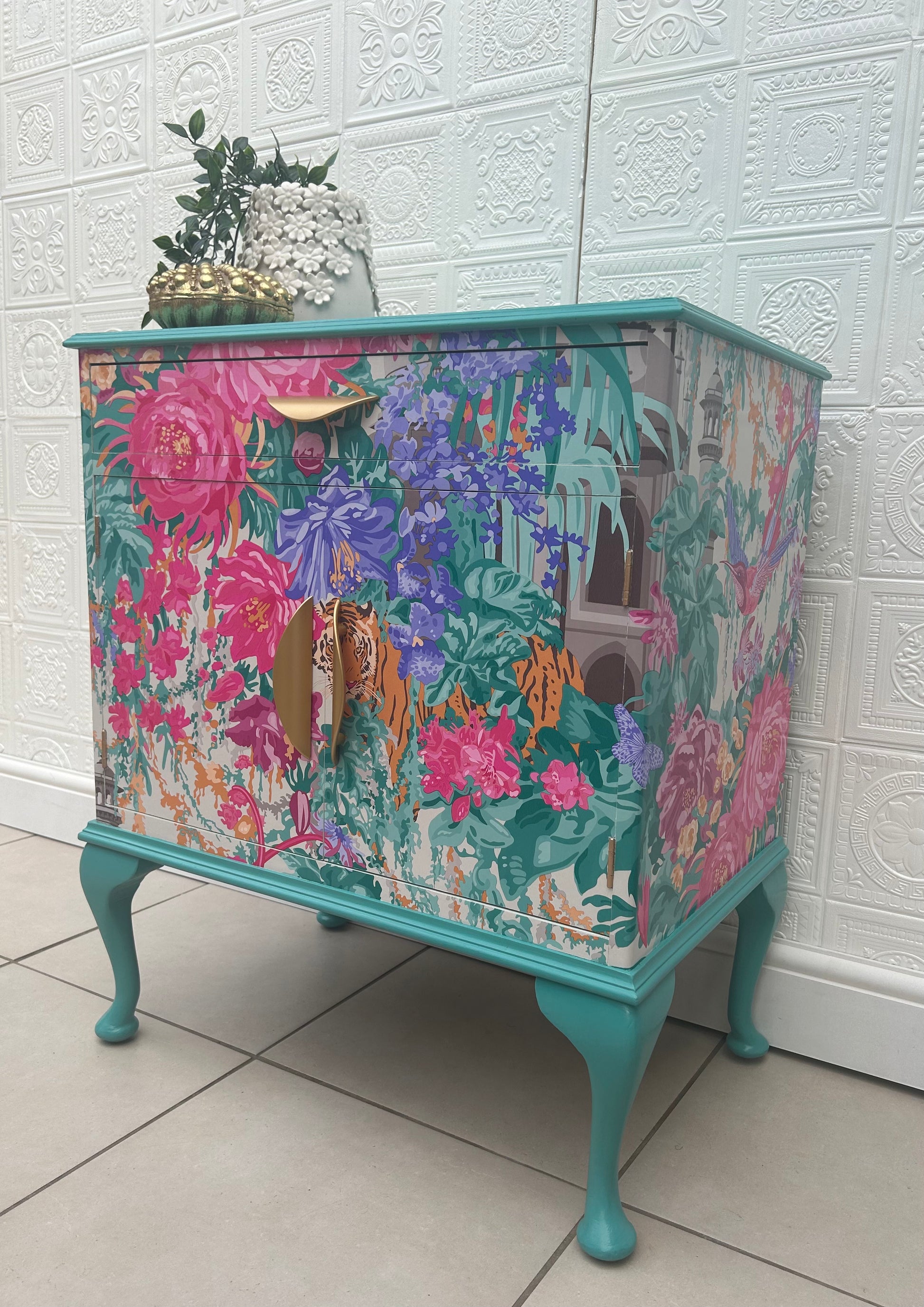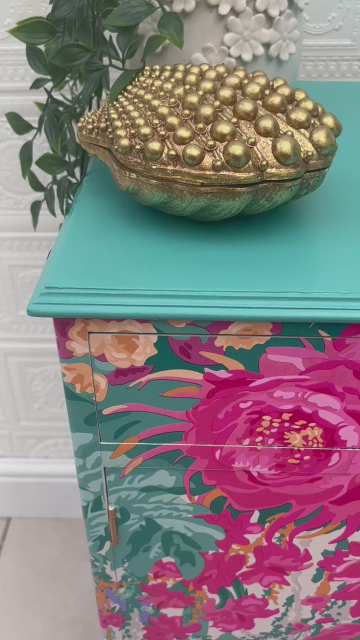 A Stunning Vintage piece that has been lovingly refinished and fully decoupaged in Matthew Williamson 'Mughal Garden' paper. The Print homes bright blues, pinks, violet and orange a truly masterpiece print. Sealed in layers of varnish for a wipeable finish. The piece has been painted in a complimentary vibrant turquoise to match the hues within the print.