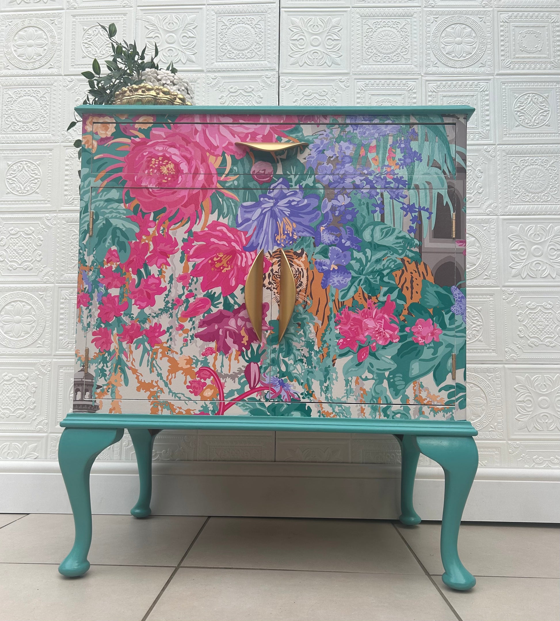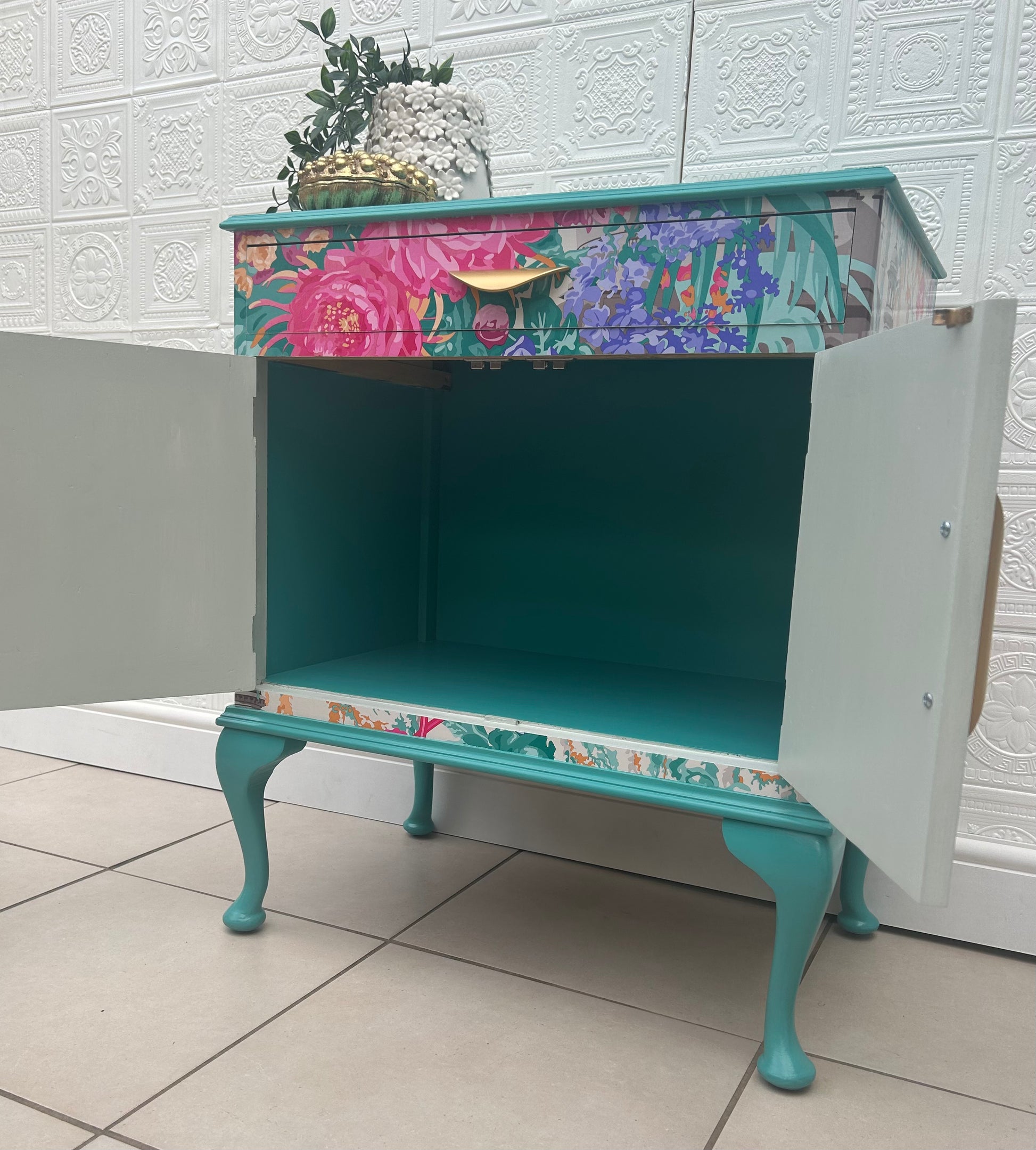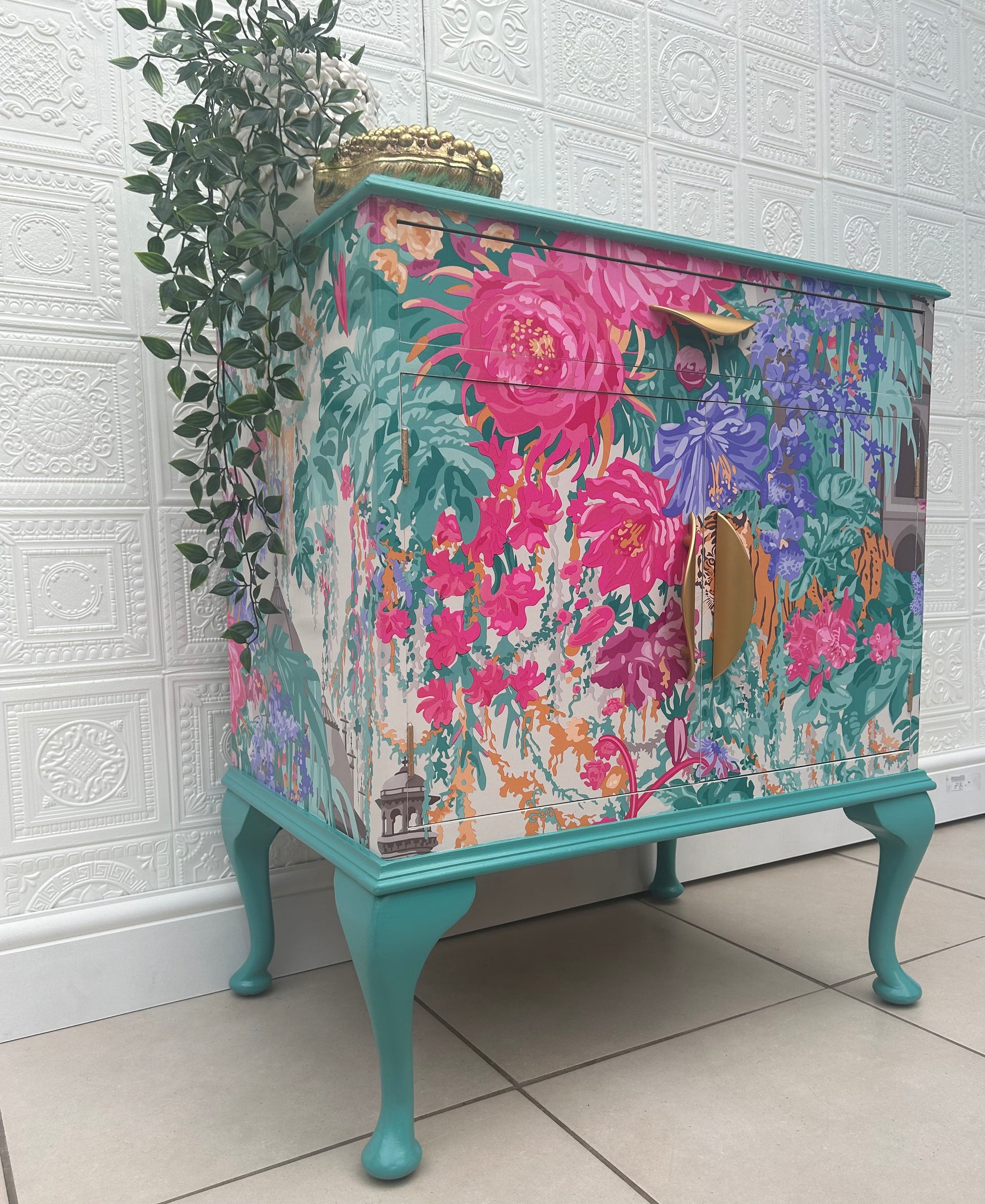 A Stunning Vintage piece that has been lovingly refinished and fully decoupaged in Matthew Williamson 'Mughal Garden' paper. The Print homes bright blues, pinks, violet and orange a truly masterpiece print. Sealed in layers of varnish for a wipeable finish. The piece has been painted in a complimentary vibrant turquoise to match the hues within the print.