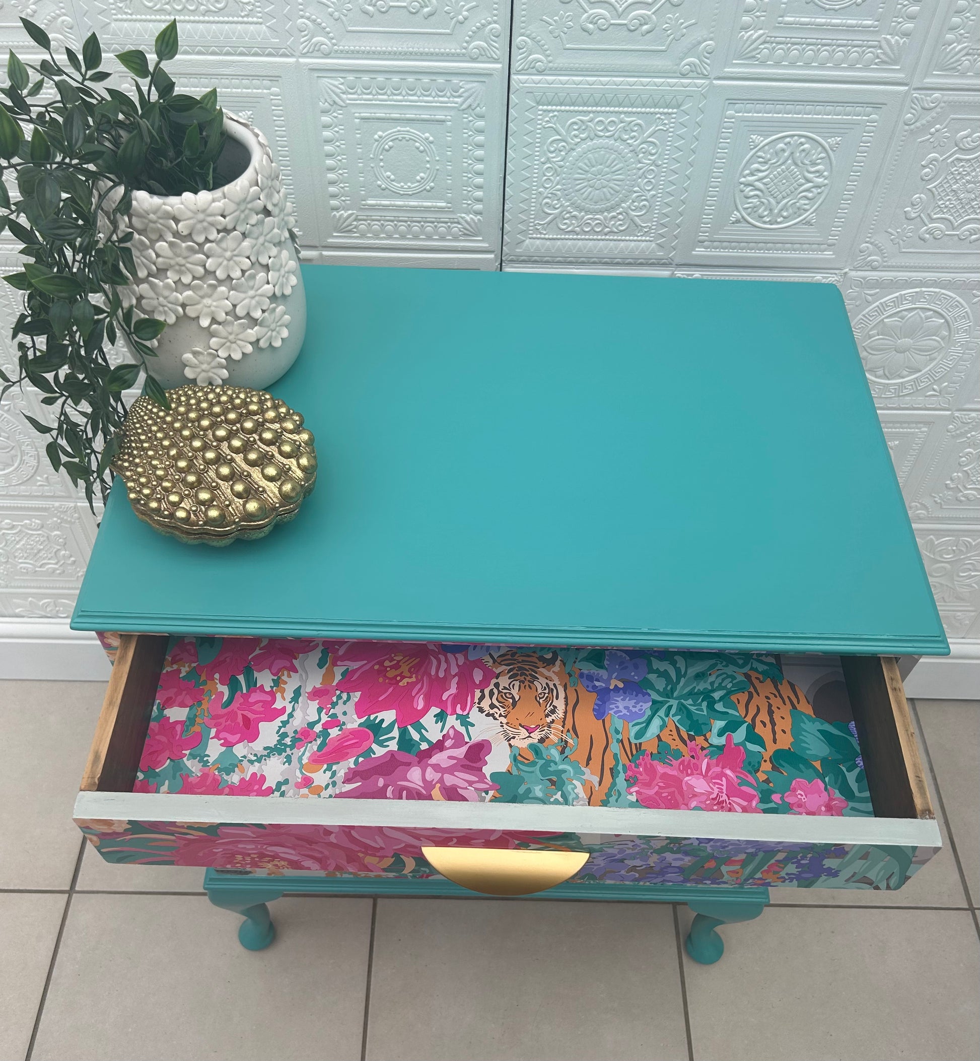 The cabinet has one full width draw that has also been lined in the statement paper. The inner cabinet has been primed and painted in the Turquoise hue and sealed in a durable matt finish.