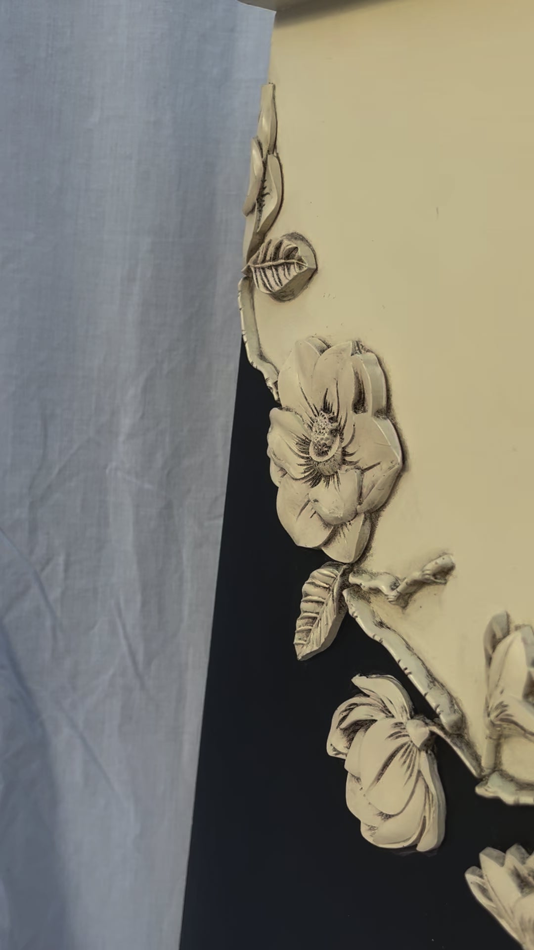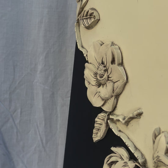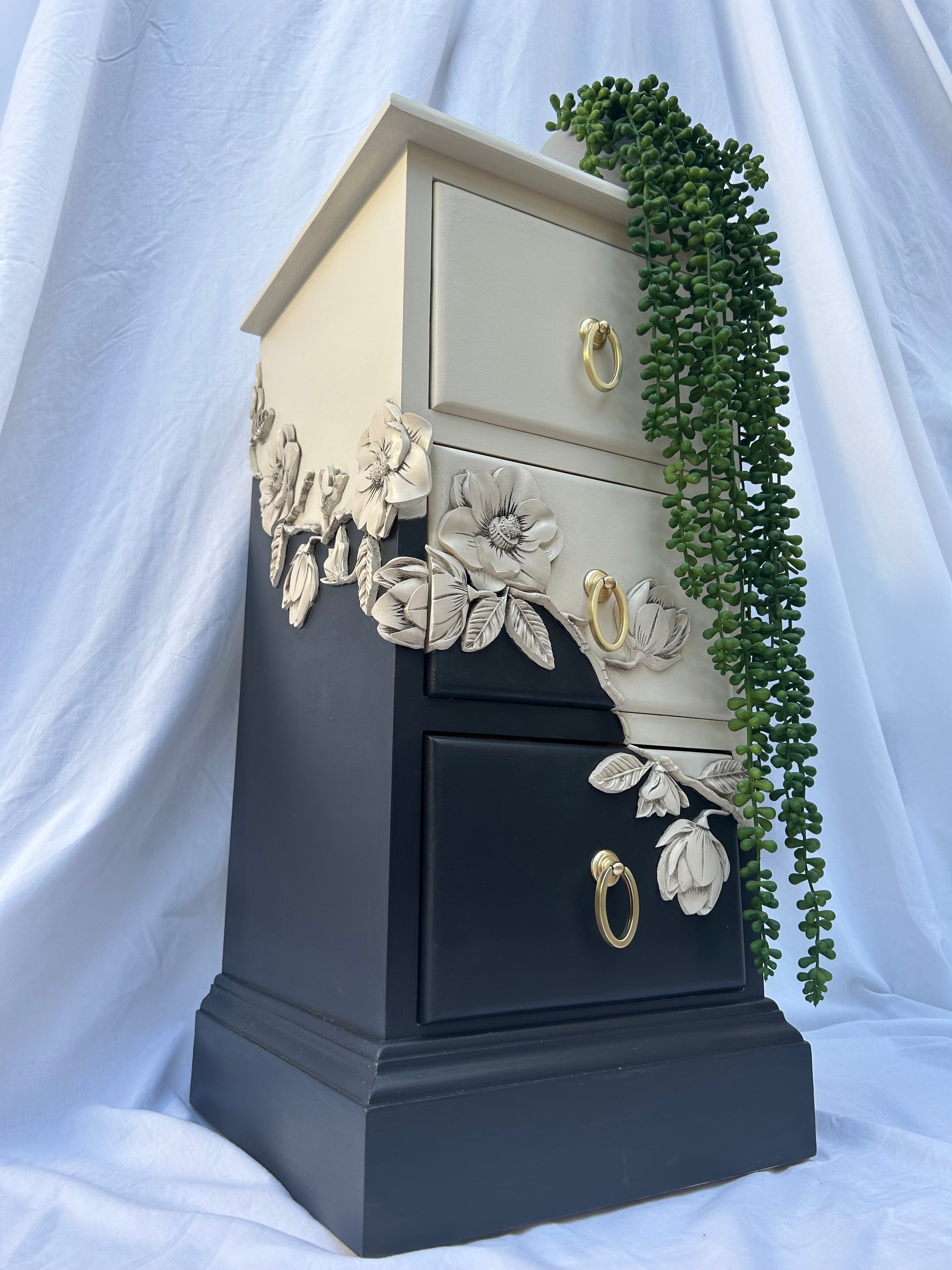 Adorned by an organic row of blooming resin flowers painted in Drop cloth and finished in black wax.