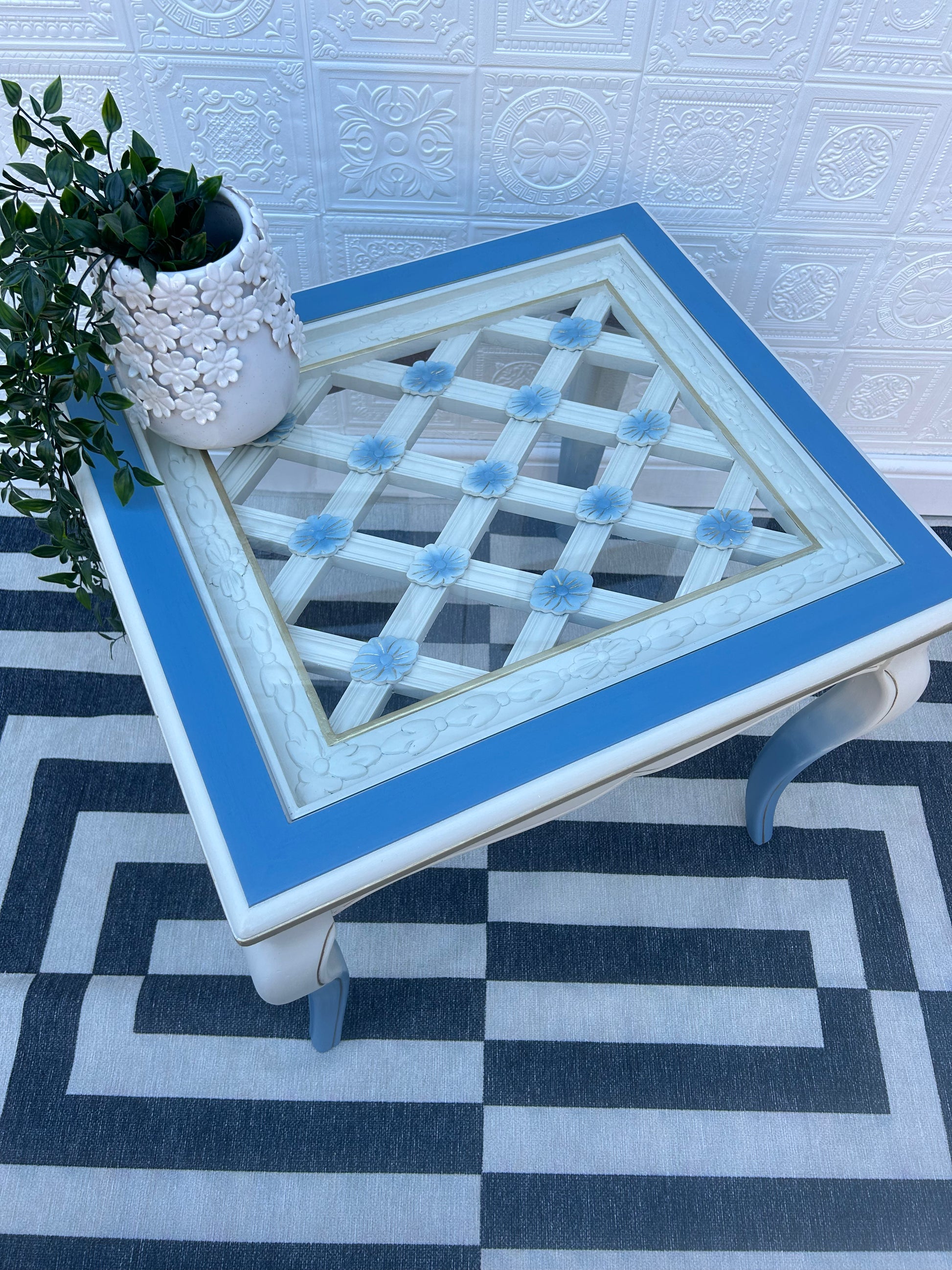 Solid wood Frame with a transparent glass top. Risen details of blue blended flowers with gold accents. Painted Gold Edge, Beautiful Ombre Saber style legs all sealed for longevity.